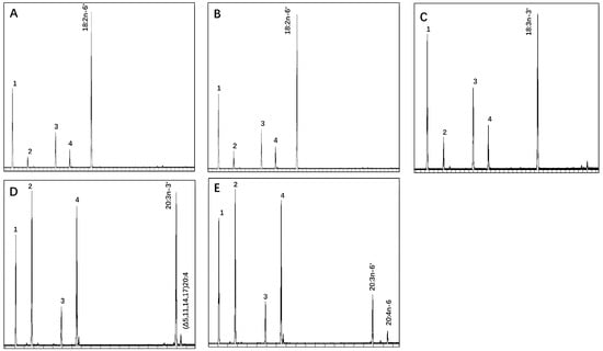 Following the identification and expression analysis, we selected the MulFadsA gene, which exhibited high expression levels and significant influence from algal dietary conditions, for subsequent functional validation experiments. Yeasts with empty pYES2 only contained endogenous FAs, including C16:0, C16:1n-7, C18:0, and C18:1n-9 (peaks 1–4) (Figure 5A), and exogenously added PUFAs (denoted with *) (Figure 5B–E). The results are consistent with the lack of PUFA desaturase activity in S. cerevisiae [30,31,32]. Yeast transformed with pYES2-MulFadsA recombinant plasmid was grown in the presence of Δ6-(18:2n-6 and 18:3n-3), Δ8-(20:3n-3), and Δ5-desaturation (20:3n-6) substrates (Figure 5B–E, respectively). The results indicate that only exogenously added 20:3n-6 was converted into 20:4n-6 (Figure 5E), indicating that MulFadsA exhibited Δ5 desaturation activity. According to the conversion rate, as presented in Table 2, 26% of C20:3n-6 was desaturated to C20:4n-6 by MulFadsA.