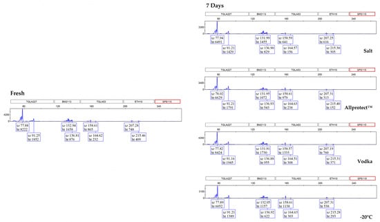 Electropherograms (showing only blue channel) of bovine DNA STR-PCR amplicons generated from fresh samples and samples preserved in salt, Allprotect™ Tissue Reagent, vodka (40% ethanol), and freezing at −20 °C for 7 days, 12 months, and 24 months. All samples yielded the complete DNA profile with the exception of 24-month-frozen bovine samples, which yielded ~97% allele recovery. sz—size, ht—height. Locus SPS115 was excluded from the allele count.