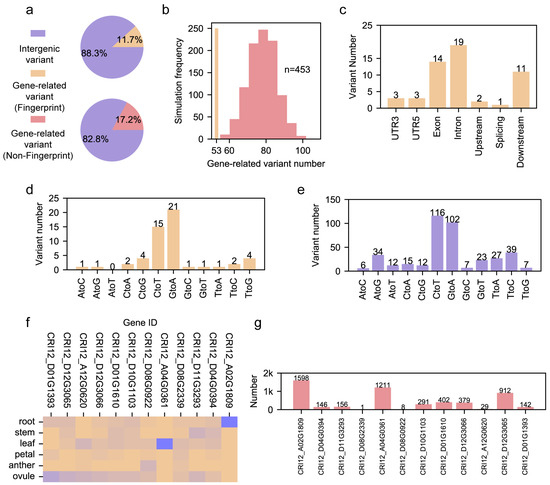 The genomic features of fingerprint genomic sites. (a) The ratio of gene-related sites in fingerprint genomic sites and non-fingerprint genomic sites. (b) The hist bar for the permutation test for repellence of fingerprint genomic sites. X-axis represents the number of gene-related sites in the down-sampled non-fingerprint sites. The Y-axis represents the frequency of events in 1000 permutations. (c) The genomic annotation of gene-related pedigree fingerprint genomic sites. (d) The number of 12 SNP types in gene-related sites from pedigree fingerprint genomic sites. (e) The number of 12 SNP types in intergenic sites from pedigree fingerprint genomic sites. (f) Heatmap of 12 genes among 6 cotton tissues; the blue color represents the high expression level, while the brown color represents a low expression level. (g) The number of genes from 12 gene regulatory networks.