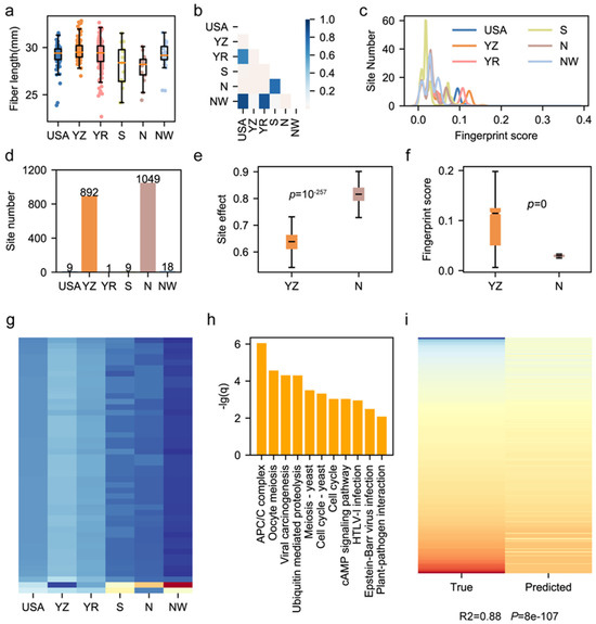 Characterization of geographical bias of a fiber-length-related sites. (a) Boxplot for fiber length of cultivars from 6 regions. (b) The p-values of the t-test on comparisons between 2 different regions. The shallow yellow color represents p-values smaller than 0.05 in the t-test. (c) Distribution of fingerprint scores possessed by fiber-length-related genomic sites in 6 regions. (d) The number of fiber-length-related genomics sites enriched in each region. (e) Phenotypic effects of fiber-length-related genomic sites enriched in the Yangze River region and North China. A t-test was used. (f) The fingerprint scores of fiber-length-related genomic sites enriched in the Yangze River and North China. A t-test was used. (g) Heatmap of fingerprint scores of 46 fiber-length-related sites of region-specificity. The blue color means a low fingerprint score, while the red color means a high fingerprint score. (h) The KEGG enrichment results of 12 genes influenced by 46 fiber-length-related sites. (i) The heatmap for true phenotype value and the predicted value generated by the expression-supported prediction model. Pearson correlation was calculated, and the chi-square test was performed.