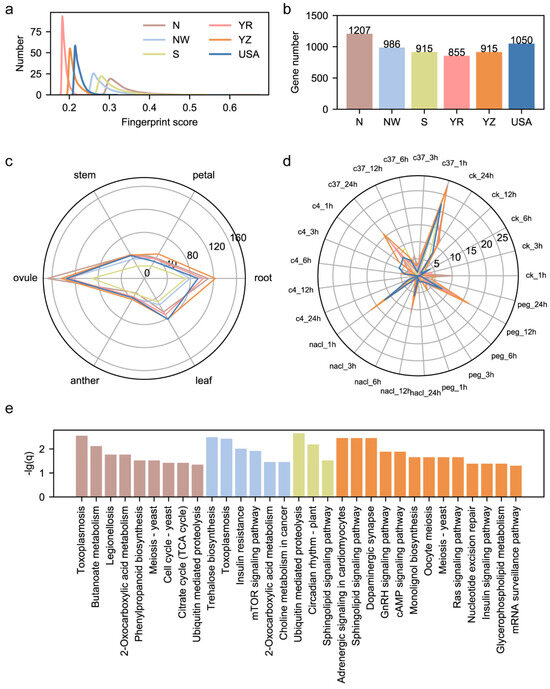 Characterization on genomic sites of high-region specificity. (a) Distribution of fingerprint scores of identified region-specific genomic sites in 6 regions. (b) The number of genes influenced by region-specific genomic sites in 6 regions. (c) The radar plot on predominantly expressed genes among 6 tissues. (d) The radar plot on predominantly expressed genes among 4 abiotic stresses. (e) KEGG enrichment results of genes influenced by region-specific genomic sites.
