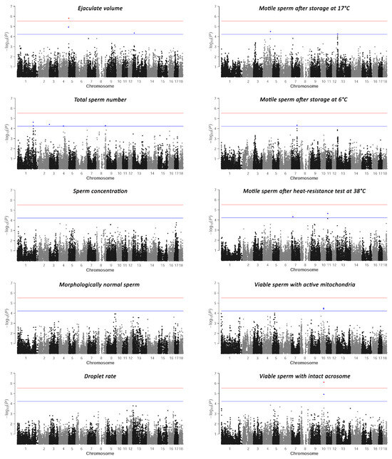Manhattan plots of the semen quality traits indicating significant SNPs which passed the suggestive evidence threshold (blue) and genome-wide evidence threshold (red).