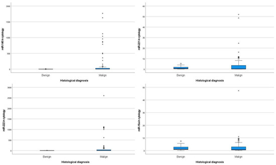 The miRNAs profile observed in histologies presented a statistically significant difference between benign and malignant tumors for the four miRNAs (Table 3), showing higher median values and a wider amplitude of expression in malignant tumors.