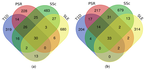 All four datasets were sent to GEO2R for DEA, in which DEGs were identified by comparing changes in the expression of genes between the positive samples and the negative controls. The DEGs from each dataset were grouped either as upregulated or downregulated based on a set adjusted p-value and FC thresholds. The T1D dataset has 420 upregulated DEGs and 274 downregulated DEGs, the PSR dataset has 332 upregulated DEGs and 318 downregulated DEGs, the SSc dataset has 612 upregulated DEGs and 776 downregulated DEGs, and the SLE dataset has 761 upregulated DEGs and 366 downregulated DEGs.