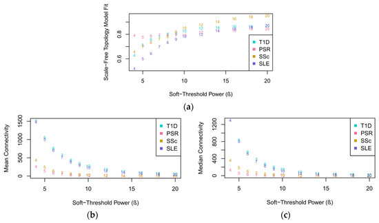 A scale-free topology model fit, including the mean and median connectivity fits, of the datasets was generated to determine the appropriate soft-thresholding power (β) in constructing the network model. As observed in Figure 2a, the datasets started to flatten out at a β value of 20; thus, it was chosen for calculating the adjacency matrices. At the lowest β value, SLE had the lowest scale-free topology fit, while PSR had the highest fit. However, only T1D, SSc, and SLE had a steady exponential increase in slope with an increasing β. PSR showed inconsistencies in its plot, as characterized by the variations in its slope with β values in the range of 5–12, but eventually flattened out at 20. At this chosen β, PSR attained the lowest scale-free topology fit, while SSc obtained the highest fit.
