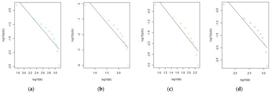 Straight-line relationship of the four datasets using β = 20 as the soft-thresholding power: (a) T1D; (b) PSR; (c) SSc; (d) SLE.