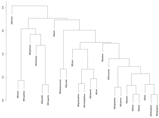 Using a deep-split parameter of 1 to obtain larger modules while maintaining efficiency in the sensitivity of the algorithm [49], we obtained 25 co-expression modules that are represented by various colors, as seen in Figure 4. The turquoise module contains 1476 genes, the blue module contains 1356 genes, the brown module contains 951 genes, the yellow module contains 761 genes, the green module contains 730 genes, the red module contains 619 genes, the black module contains 523 genes, the pink module contains 358 genes, the magenta module contains 327 genes, the purple module contains 285 genes, the green–yellow module contains 268 genes, the tan module contains 248 genes, the cyan module contains 245 genes, the salmon module contains 245 genes, the light-cyan module contains 229 genes, the midnight-blue module contains 229 genes, the grey60 module contains 209 genes, the light-green module contains 200 genes, the light-yellow module contains 183 genes, the royal-blue module contains 164 genes, the dark-red module contains 128 genes, the dark-green module contains 116 genes, the gold module contains 100 genes, the dark-turquoise module contains 78 genes, and the dark-grey module contains 44 genes.