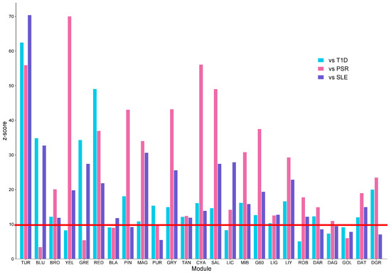 Figure 5 shows the preservation analysis of the 25 modules from the SSc network. Only 13 modules were highly preserved across the three datasets, as follows: turquoise, brown, red, magenta, green yellow, tan, cyan, salmon, midnight blue, grey60, light green, light yellow, and dark turquoise. The red line highlights the z-score threshold equal to 10.