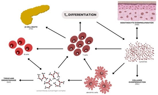 Interconnected pathways associated with TH17 differentiation involved in the pathogenesis of T1D, PSR, SSc, and SLE. In T1D, CD4+ T cells found in the pancreatic islets activate TH17 differentiation, which contributes to the increased production of IL-1β, IL-6, and TNF-α. These cytokines allow the easy penetration of CD4+ and CD8+ T cells in the pancreas, allowing the direct killing of β cells. In PSR, the secretion of IL-17A and IL-22 causes the migration of more TH17 cells in the inflammation site, which results in epidermal acanthosis. The activation of mDCs, which is one of the triggers in PSR, initiates TH17 differentiation to continue producing the cytokines responsible for maintaining the cyclic overgrowth of keratinocytes. In SSc, TH17 cells promote fibrosis of the skin and lungs by activating the production and stimulation of collagen. SSc incidence also shows a correlation with IL-22, which is a pro-inflammatory cytokine found in the skin. Lastly, activated CD4+ T cells may play a role in the elevated levels of IL-17 in SLE patients. Overexpression of the IL-17 gene was also found to be associated with the manifestation of the disease.