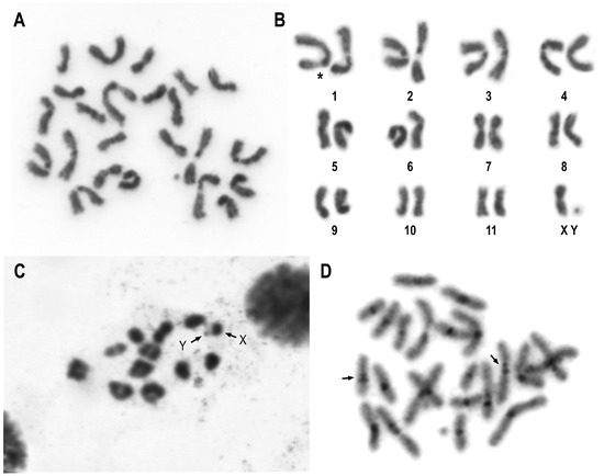 - Adega, F.; Guedes-Pinto, H.; Chaves, R. Satellite DNA in the karyotype evolution of domestic animals—Clinical considerations. Cytogenet. Genome Res. 2009, 126, 12–20. [Google Scholar] [CrossRef]