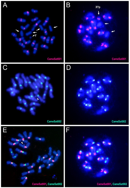 FISH using the CameSat001-141 satDNA (labeled in red) as a probe on both mitotic (A) and meiotic (B) chromosomes of C. americana. Similarly, FISH was conducted using the CameSat002-187 satellite DNA (labeled in green) on mitotic (C) and meiotic (D) chromosomes. Double FISH using both the probes on mitotic (E) and meiotic (F) chromosomes. Arrows indicate the chromosomes or the bivalents that did not display a hybridization signal with CameSat001. Arrowheads indicate the Y chromosome, which did not exhibit a hybridization signal with either of the two probes.