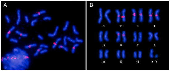 Fluorescence in situ hybridization (FISH) was performed following the protocol of Cabral-de-Mello and Marec [51], with some modifications. In total, 20 μL of the hybridization solution (50% deionized formamide (v/v), 10% dextran sulfate (v/v), and 2× SSC), containing 3 pmol/µL of the satDNA oligonucleotide probe or 10 ng/µL of the telomere probe, was administered per slide. For two-color FISH experiments, 40 μL of the hybridization solution with 3 pmol/µL for each probe was used, one labeled with biotin-16-dUTP and the other with digoxigenin-11-dUTP. The slides were subjected to incubation on a heated surface at a temperature of 70 °C for a duration of 2 min and 30 s, transferred to a humid chamber, and subjected to overnight incubation (16–18 h) at a temperature of 37 °C. Immunological detection was performed using either streptavidin conjugated with Alexa Fluor™ 488 (Thermo Fisher Scientific, Waltham, MA, USA) at a concentration of 10 μg/mL or anti-digoxigenin-rhodamine (Roche) at a concentration of 1 μg/mL, depending on whether the probes were labeled with biotin-16-dUTP or digoxigenin-11-dUTP, respectively.