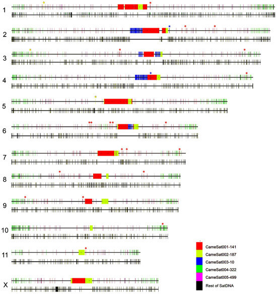 C. americana pseudochromosomes showing the distribution of different satDNA families obtained through the CHRISMAPP approach. For each chromosome, two schemes are displayed, the top one illustrates the distribution of the five most abundant satDNA families, while the bottom one shows the distribution of the remaining satDNA families (from CameSat006-2670 to CamaSat165-105). Asterisks indicate the presence of short arrays of the CameSat001-141, CameSat002-187, and CameSat003-10.