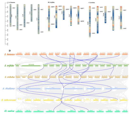 Chromosome localization and distribution of SSs in I. batatas, I. trifida, and I. triloba (A–C). Chromosome numbers are shown on the left and gene names on the right. (D) Collinearity analyses of SSs in I. batatas, I. trifida, I. triloba, A. thaliana, S. lycopersicum, and O. sativa are indicated by different colors. Orange, light green, brown, light blue, yellow, and green, respectively, represent I. batatas, I. trifida, I. triloba, A. thaliana, S. lycopersicum, and O. sativa.