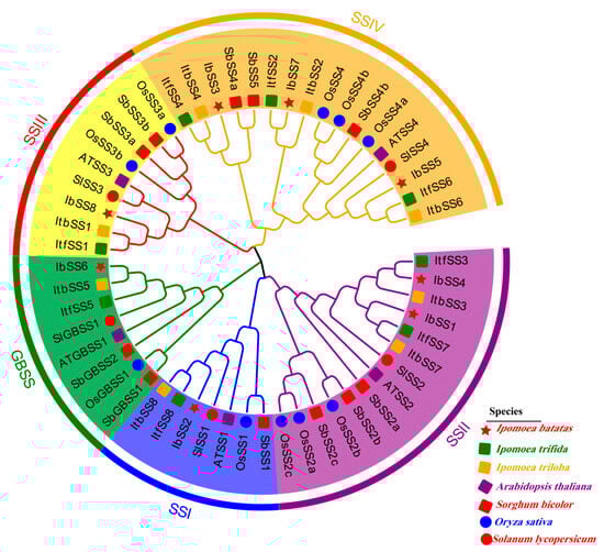 Phylogenetic analyses of SSs in I. batatas, I. trifida, I. triloba, A. thaliana, S. bicolor, O. sativa, and S. lycopersicum. Based on the evolutionary analysis, the 24 SSs were categorized into five groups (I, II, III, and IV are indicated in blue, purple, red, and orange, respectively), with green indicating granule-bound starch synthases. Red pentagrams indicate eight IbSS in I. batatas, green squares indicate eight ItfSS in I. trifida, orange squares indicate eight ItbSS in I. triloba, purple squares indicate five ATSS in A. thaliana, red squares indicate 11 SbSS in S. bicolor, blue circles indicate 10 OSSs in O. sativa, and red squares indicate five SlSS in S. lycopersicum.