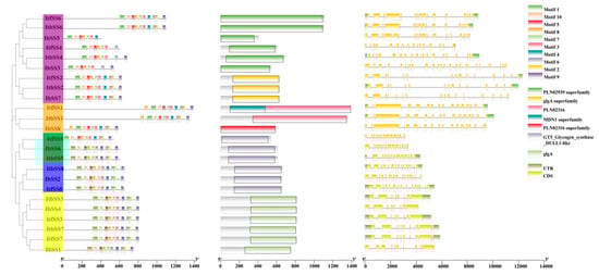 The protein sequences and GFF gene annotation files of I. batatas, I. trifida, and I. triloba were obtained from the Sweet Potato Genomics Resource (Sweetpotato Genomics Resource (uga.edu), accessed on 17 July 2023) and Ipomoea Genome Hub (https://ipomoea-genome.org/, accessed on 17 July 2023). The Cryptomarkov model (HMM) profile of the glycosyltransferase domain (PF08323 and PF00534) was downloaded from the Pfam (Pfam: Home page (xfam.org)) database and used to investigate all protein sequences in I. batatas, I. trifida, and I. triloba. The Arabidopsis, S. bicolor, and S. lycopersicum SS protein sequences were downloaded at Ensembl Plants (https://plants.ensembl.org/index.html, accessed 20 September 2023). The O. sativa SS protein sequences were obtained from the National Rice Data Center (RiceData = Rice Gene Database, accessed on 22 June 2023). The HMMER Search program in Tbtools software was used to preliminarily screen the SS candidate genes. All putative SS were further screened using SMART (SMART: Main page (embl.de), accessed on 22 June 2023) and finally further validated by the conserved database CDD (Welcome to NCBI Batch CD-search (nih.gov), accessed on 22 June 2023) [48]. Finally, with the full-length transcriptome of third-generation sequenced “Guangshu 87” as a reference, the candidate sweet potato SS family members were manually corrected using SnapGene software 6.0.2. Screened genes of IbSS, ItfSS, and ItbSS were named sequentially based on chromosomal location. The physicochemical properties of IbSS, ItfSS, and ItbSS proteins were analyzed based on the basic information of the protein sequences determined by our laboratory in the company and the Expasy online tool (SIB Swiss Institute of Bioinformatics Expasy, accessed on 22 June 2023) [49]. TBtools software Version 2.0 was used for visualization and mapping [50].