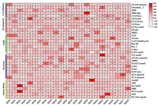 Analysis of cis−elements in the promoters of SS from I. batatas, I. trifida, and I. triloba. The cis−elements were categorized into six groups. The intensity of the red hue indicates the quantity of cis-elements in the SS promoters.