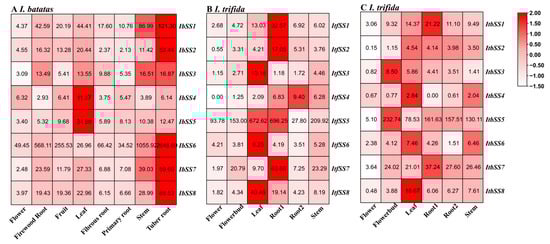 Expression analysis of SS in different tissues of I. batatas, I. trifida, and I. triloba using RNA-seq. (A) Expression analysis of IbSSs in different tissues. (B) Expression patterns of ItfSSs in the flower, flowerbud, leaf, stem, root1, root2, and stem of I. trifida. (C) Expression patterns of ItbSSs in the flower, flowerbud, leaf, stem, root1, root2, and stem. The FPKM values were shown in the boxes.