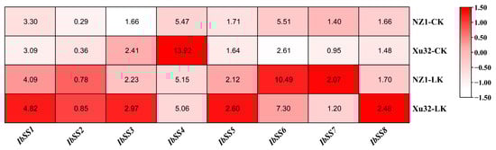 Figure 9 presents the detected expression profiles of the eight IbSSs, using transcriptome data from “Shenshu 28” (a cold-sensitive variety) and “Liaohanshu 21” (a cold-tolerant variety) under cold stress conditions. Under cold stress, in “Shenshu 28”, IbSS4 and IbSS6 were up-regulated, and in “Liaohanshu 21”, IbSS2, IbSS4, IbSS6, and IbSS8 were up-regulated.