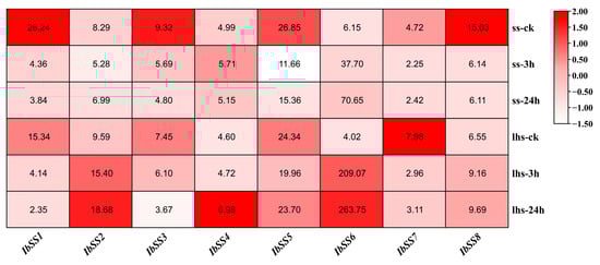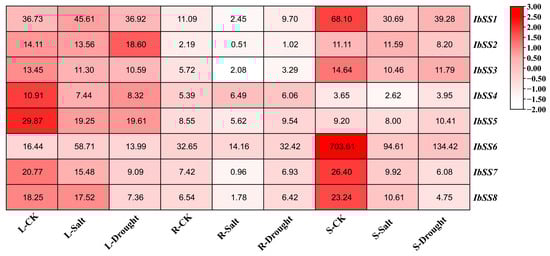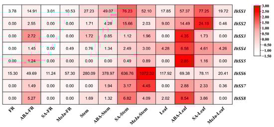 Using the “Xushu 18” RNA-seq data retrieved from the NCBI database (PRJNA511028), the expression patterns of eight SS genes in sweet potato were analyzed in three different tissues following treatments with ABA, SA, and MeJA (Figure 7). In fibrous roots, the expression of eight SS genes was up-regulated after ABA treatment; among them, the expression level of the IbSS6 gene was particularly high; IbSS1 and IbSS6 genes were down-regulated after SA treatment; other genes showed no changes; IbSS1, IbSS4, and IbSS6 were up-regulated after MeJa treatment; among them, IbSS6 was significantly increased in the fibrous roots. In stems, IbSS3 and IbSS8 decreased after ABA treatment; there was no change before and after IbSS5, the other genes were up-regulated to varying degrees, among which IbSS1 and IbSS6 were significantly up-regulated; under SA treatment, except for IbSS3, all other genes were up-regulated, particularly IbSS1, IbSS2, IbSS6, and IbSS8 were significantly increased; after MeJa treatment, all IbSSs genes were up-regulated; among them, IbSS1, IbSS6 and IbSS7 have been significantly increased. In leaves, under ABA and SA treatment, IbSS6 was downregulated, and other genes were upregulated; after MeJa treatment, IbSS2, IbSS4, IbSS6, and IbSS8 were downregulated, and IbSS1 and IbSS7 were raised.