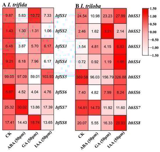 We also utilized the expression levels of I. trifida and I. triloba under ABA, GA, and IAA treatments. After ABA treatment, ItfSS7, ItbSS3, and ItbSS7 were up-regulated. After GA treatment, ItfSS1, ItfSS8, ItbSS2, ItbSS4, and ItbSS6 were up-regulated. Under IAA treatment, ItfSS5, ItbSS1, ItbSS3, ItbSS4, ItbSS6, and ItbSS8 were up-regulated (Figure 8).