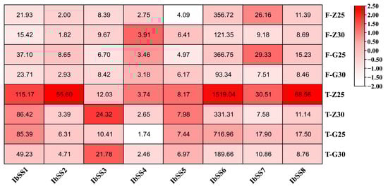 We used the heat-tolerant variety “Guangshu 87” and the heat-sensitive material “Ziluolan” to detect the expression profiles of SS genes in sweet potatoes after heat stress (Figure 11). After heat treatment, the expression levels of the IbSS3, IbSS4, and IbSS5 genes in the fibrous roots of the “Ziluolan” cultivar were up-regulated, while the other genes were down-regulated. Except for IbSS3 and IbSS5, all other genes were down-regulated in the tuberous roots. IbSS3 and IbSS5 were up-regulated in the fibrous roots of the “Gunagshu 87” cultivar, and all other genes were down-regulated, except for IbSS3. The other genes were down-regulated in the tuber roots.