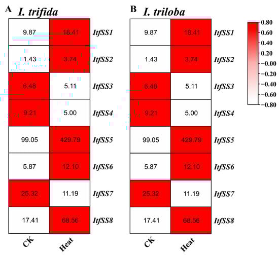 We also analyzed the expression levels of ItfSSs and ItbSSs under 35 °C heat stress (Figure 12). After heat treatment, except for ItfSS3, ItfSS4, ItfSS7, ItbSS3, ItbSS4, and ItbSS7, the transcript levels of the others were increased.