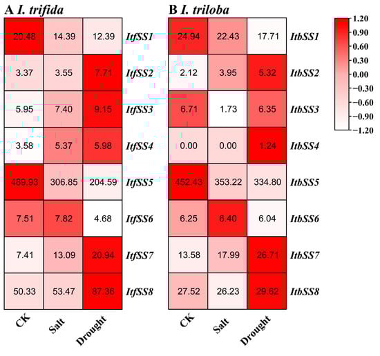 We analyzed the expression levels of ItfSSs and ItbSSs under drought and salt stress to understand the role of ItfSSs and ItbSSs in two closely related species (Figure 14). In I. trifida (Figure 14A), after salt treatment, ItfSS1 and ItfSS5 were down-regulated, and other ItfSSs were up-regulated; under drought treatment, ItfSS1, ItfSS5, and ItfSS6 were down, and other ItfSSs were raised. In I. triloba (Figure 14B), under salt treatment, ItbSS2, ItbSS6, and ItbSS7 were regulated upward, ItbSS4 remained unchanged, and other ItbSSs were down-regulated; after drought treatment, ItbSS2, ItbSS4, ItbSS7, and ItbSS8 were adjusted upward, while other ItbSSs were downgraded.