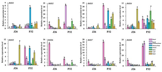 Expression analysis of SS genes in sweet potato different tissue sites. J26: “Jishu 26”; P32: “Pushu 32”; root1: large tuber roots; root2: small tuber roots. Lowercase letters indicate a significant difference in each IbSS at p < 0.05 as determined by one-way ANOVA, with Tukey’s post hoc test conducted afterwards.