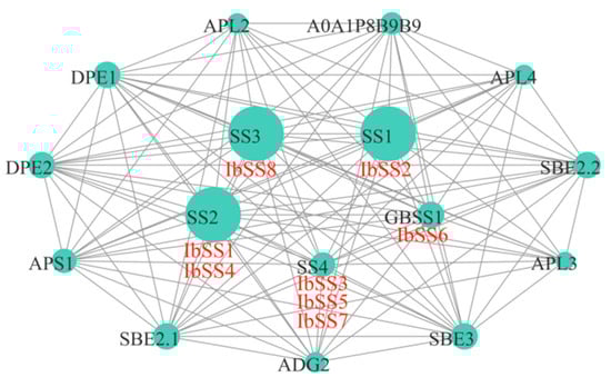 To investigate the potential regulatory network of SS, we constructed an IbSS interaction network map based on Arabidopsis homologous proteins (Figure 16). IbSS could interact with glucose-1-phosphate adenylyltransferases (ADG2, APS1, APL2, APL3, and APL4), dismutases (DPE1, DPE2), starch branching enzymes (SBE2.1, SBE2.2, SBE3), and UDP-glycosyltransferases (A0A1P8B9B9). Protein interaction predictions indicated that all eight IbSSs were homologous to Arabidopsis proteins, IbSS2 was homologous to SS1; IbSS1 and IbSS4 were homologous to SS2; IbSS3, IbSS5, and IbSS7 were homologous to SS4; IbSS6 was homologous to GBSS1; and the homology with SS4 was also up to 31.4%. These results suggest that IbSS plays an important role in the metabolic development of sweet potato.