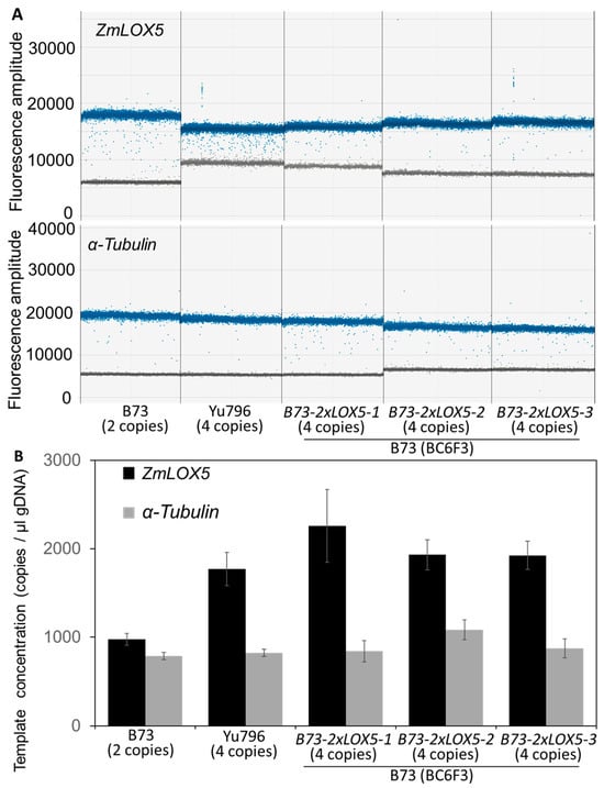 Representative 1D droplet plots showed the well-defined distribution of positive (shown in blue color) and negative individual droplets (in grey color) in the upper panel for ZmLOX5 and the lower panel for the reference gene, α-Tubulin (Figure 1A). As shown in Figure 1B, the copy concentration of ZmLOX5 is 977 in B73, while almost double concentration of ZmLOX5 is found in Yu796 (1769) and the three independent near-isogenic B73-2×LOX5 lines (2259, 1930, and 1923, respectively). In contrast to the target gene, ZmLOX5, an almost equal copy number concentration was determined in each individual for the reference gene, α-Tubulin, representing the single copy gene. The relative copy numbers of ZmLOX5 were calculated using α-Tubulin as internal controls [33,35], and the results reveal that only B73 contained a one-fold change in the ZmLOX5/α-Tubulin ratio, while Yu796 and the three independent B73-ZmLOX5 lines contained two-fold changes in ZmLOX5/α-Tubulin ratios, indicating that these individuals carry duplicate copies of ZmLOX5 whereas B73 encodes a single copy of ZmLOX5, as expected (Figure 1C).