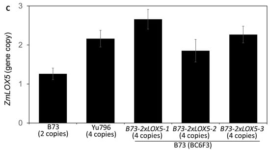 To generate near-isogenic lines carrying duplicated copies of ZmLOX5 in the B73 genetic background, we backcrossed the Yu796-2×LOX5 locus six times into the lox5-3 mutant, which was previously backcrossed seven times to B73 as described in [22], with selection carried out against the mutant locus at each backcross stage. This resulted in the generation of B73 lines containing the Yu796-2×LOX5 locus, designated as B73-2×LOX5, that contained two CNV copies of ZmLOX5 instead of the single ZmLOX5 gene found in inbred B73. To confirm the gene copy number variation, we used ddPCR to test the concentration of ZmLOX5 gene dosage. The ddPCR results show that twice as many ZmLOX5 template molecules were found in Yu796 and the three independent near-isogenic lines of B73 carrying duplicated ZmLOX5 at the BC6F3 genetic stage as compared to B73 (Figure 1).