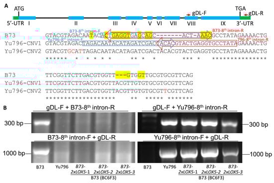 To characterize nucleotide sequence polymorphism between the two CNVs of ZmLOX5, hereafter named ZmLOX5-CNV1 and ZmLOX5-CNV2, we have PCR-amplified, cloned into a TOPO TA vector, and sequenced a 1.3 Kb ZmLOX5 fragment containing the 3′ portion of the gene spanning the partial eighth and the entire ninth exons of the ZmLOX5 gene [30], the eighth intron, and partial 3′-UTR (the portion of the gene between the primers gDL-F and gDL-R shown in the upper panel in Figure 2A). Sequencing of the eighth and ninth exons revealed 12 SNPs differentiating Yu796-CNV1 from Yu796-CNV2 (Table S3). As expected, the greatest nucleotide polymorphism was identified in the eighth intron, where sequencing results reveal the presence of four SNPs differentiating Yu796-CNV1 from Yu796-CNV2 and sixteen SNPs that differentiate B73-ZmLOX5 from both Yu796-CNV1 and Yu796-CNV2 (Figure 2A). Importantly, there were two InDels that differentiate the B73 allele from both Yu796 CNVs that we exploited for PCR-based differentiation between the B73-ZmLOX5 and ZmLOX5-CNVs by designing primers that specifically amplified either the B73 or Yu796 loci.