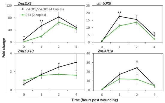 It is often reported that CNVs effect the expression level of the gene by virtue of the difference in the number of functional copies [29,37]. Therefore, we measured ZmLOX5 transcript accumulation in B73 and the B73-2×LOX5 lines. The qRT-PCR analysis showed that ZmLOX5 expression was increased by 7.8-fold at the resting stage and 2.8-fold at 1 hpw in the lines harboring duplicated ZmLOX5 compared to B73 (Figure 3), indicating that the duplication of the gene resulted in enhanced expression in both untreated and wounded leaves. Unlike ZmLOX5 at the resting stage, expression of the JA biosynthesis genes, ZmLOX8, ZmLOX10, and ZmJAR1a [23], are not significantly altered between B73-2×LOX5 and B73 lines. However, in response to mechanical wounding, ZmLOX10 and ZmJAR1a expression were increased 1.9- and 2.1-fold, respectively, at 2 hpw, and ZmLOX8 expression was increased 1.6-fold at 1 hpw (Figure 3). The increased expression of ZmLOX8, ZmLOX10, and ZmJAR1a suggested increased biosynthesis of 12-OPDA, GLV, and/or other jasmonates.