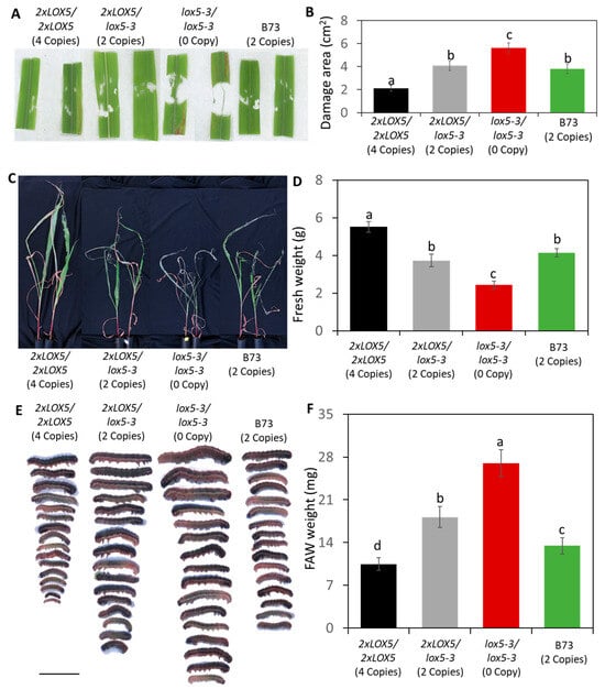 Increased gene dosage of ZmLOX5 results in increased resistance to fall armyworms (FAWs). (A,B) Effect of ZmLOX5 duplication on FAW resistance during localized herbivory in the homozygous seedlings (2×LOX5/2×LOX5, 4 copies), heterozygous seedlings (2×LOX5/lox5-3, 2 copies), knockout mutants (lox5-3/lox5-3, 0 copies), and B73 (2 copies). Second- to third-instar larvae were confined to clip-cages positioned on the maize leaf and allowed to feed for 6–8 h. Area consumed was determined via ImageJ analysis of scanned leaves. (C–F) The individual seedlings as in (A,B) were exposed to continued feeding by 8 neonates per seedling for 7 days. Afterwards, seedlings were photographed (C) and weighed (D). Bars are means ± SE; n = 6–7. The recovered larvae were photographed (E), and the fresh weights of recovered larvae were weighed (F). Bars are means ± SE; n = 16–20. Groups with different letters (a,b,c,d) represent statistically significant differences (p < 0.05) via one-way ANOVA with Tukey HSD post-hoc test.