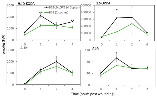 Our previous study revealed that wound-triggered JA-Ile production was reduced along with 9,10-KODA, 12-OPDA, and ABA in the lox5 mutants, resulting in decreased FAW defense [22]. Therefore, we assessed whether increased resistance to FAW in B73-2×LOX5 seedlings resulted from increased JA accumulation. Surprisingly, wound-induced JA-Ile production in B73-2×LOX5 was not significantly increased as compared to B73 (Figure 5), suggesting that JA-Ile is not a major reason for increased resistance. However, metabolite analyses revealed that the levels of wound-induced 9,10-KODA, the major product of ZmLOX5 [22], and ABA were significantly increased at 1 and 4 hpw, while 12-OPDA production was significantly increased at 1 hpw in the B73-2×LOX5 seedlings compared to B73. These results are consistent with our previous study that showed that exogenous treatment with 9,10-KODA strongly induced 12-OPDA and ABA, regardless of wounding, while having a modest inhibitory effect on the wound-induced JA-Ile production [22].