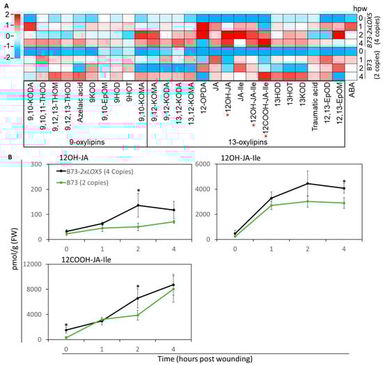 JA catabolites 12OH-JA, 12OH-JA-Ile, and 12COOH-JA-Ile were significantly increased in the B73-2×LOX5 seedlings in response to mechanical wounding. (A) Heatmap showing relative accumulation of 9-oxylipins, 13-oxylipins, and ABA in B73-2×LOX5, duplicated copy variant (2×ZmLOX5/2×ZmLOX5, 4 copies of ZmLOX5 in the B73 genetic background at the BC6F3 genetic stage) and B73 inbred line (2 copies of ZmLOX5) at 1, 2, and 4 h post wounding (hpw) compared to unwounded B73. Cells are shaded with Z-score scaling within columns, with the more abundant metabolite in red and the less abundant metabolite in blue. (B) For each graph, the X-axis represents hpw and the Y-axis represents metabolite concentration in pmol/g FW for each JA catabolite (12OH-JA, 12OH-JA-Ile and 12COOH-JA-Ile) indicated within the graphs. Black line represents duplicated copy variant (2×ZmLOX5/2×ZmLOX5, 4 copies of ZmLOX5 in the B73 genetic background at the BC6F3 genetic stage) and green line represents B73 inbred line (2 copies of ZmLOX5); bars are means ± SE; n = 4–5; asterisks represent significant differences between near-isogenic 2×LOX5 and B73-LOX5 at each time point using Student’s t-test (* p < 0.05).