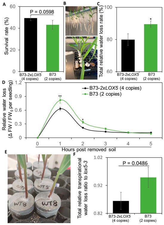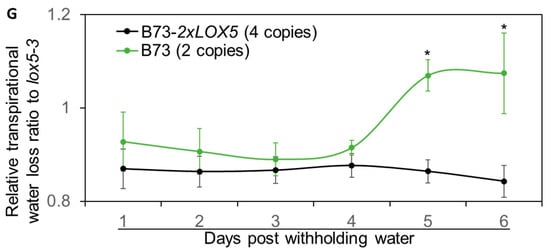 ABA and 12-OPDA play a key role in the regulation of drought tolerance in plants [40,41]. Due to the elevated stress-induced levels of ABA and 12-OPDA in B73-2×LOX5 seedlings, we tested whether the duplication of ZmLOX5 altered maize response to drought. The dehydration stress tests revealed that B73-2×LOX5 seedlings exhibited moderately increased survival rate under 14 days of drought stress followed by rewatering (Figure 7A). ABA and 12-OPDA promote drought tolerance through regulation of stomatal closure [42,43]; hence, we assessed water loss in B73-2×LOX5 and the B73 inbred line upon seedling exposure to drought (Figure 7B). As shown in Figure 7C, B73-2×LOX5 lost less water as compared to B73 in response to seedling dehydration for 17 h. Furthermore, reduced water loss in B73-2×LOX5 was already evident at 1 and 2 h post water deprivation (Figure 7D). To further measure whether the duplication of ZmLOX5 enhanced relative drought tolerance levels, we determined transpirational water loss in response to long-term withholding of water (Figure 7E). Similar to the short-term dehydration test, we observed that less water was lost through transpiration in B73-2×LOX5 compared to B73 after 6 days of withholding water (Figure 7F). These observations suggest that the duplication of ZmLOX5 increased maize tolerance to drought stress. Further field-based tests will be needed to firmly establish whether the duplication significantly promotes drought tolerance.