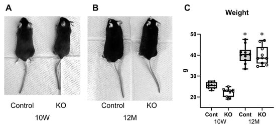 KO mice treated with tamoxifen from seven days of age were slightly smaller than the control mice at 10 weeks of age but showed no morphological abnormalities (Figure 1A). KO mice treated with tamoxifen from 10 weeks of age were the same size as control mice at 12 months of age with no morphological abnormalities (Figure 1B). Body weights were 25.25 ± 1.45 g for 10-week-old control mice, 22.19 ± 1.93 g for 10-week-old KO mice, 40.30 ± 4.24 g for 12-month-old control mice, and 39.85 ± 4.39 g for 12-month-old KO mice (n = 10/group). One-way ANOVA showed significant differences between the groups (F(3,36) = 84.26, p < 0.01). Both control and KO mice were significantly heavier at 12 months than at 10 weeks of age (p < 0.01); however, there was no significant difference in body weight between the control and KO mice at 10 weeks (p = 0.18) or 12 months (p = 0.99) of age.