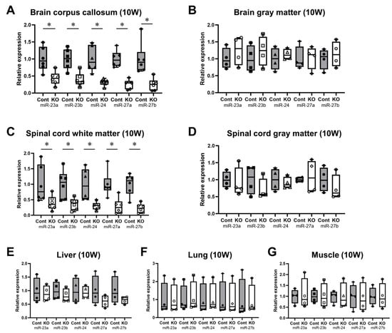 Expression levels of miRNAs in the miR-23a/b clusters (miR-23a, miR-23b, miR-24, miR-27a, and miR-27b) at 10 weeks of age. Control (Cont) and myelin-specific miR-23a/b cluster knockout mice (KO); n = 6 per group. (A) Brain corpus callosum. (B) Brain gray matter. (C) Spinal cord white matter. (D) Spinal cord gray matter. (E) Liver. (F) Lung. (G) Skeletal muscle. * Significant difference between Cont and KO mice, p < 0.05. 10W = 10-week-old mice.