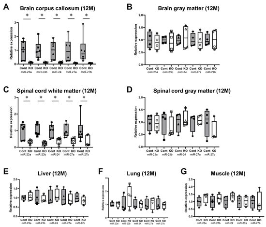 Expression levels of miRNAs in the miR-23a/b clusters (miR-23a, miR-23b, miR-24, miR-27a, and miR-27b) at 12 months of age. Control (Cont) and myelin-specific miR-23a/b cluster knockout mice (KO); n = 6 per group. (A) Brain corpus callosum. (B) Brain gray matter. (C) Spinal cord white matter. (D) Spinal cord gray matter. (E) Liver. (F) Lung. (G) Skeletal muscle. * Significant difference between Cont and KO mice, p < 0.05. 12 M = 12-month-old mice.