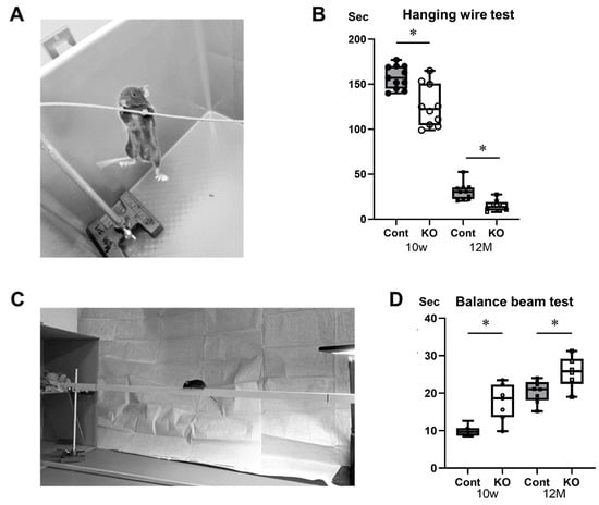 Behavioral assessments were performed on 10-week-old and 12-month-old control and KO mice. Motor function tests were performed using methods described in previous reports, including the hanging wire and balance beam tests [14,24,25]. The hanging wire test assessed overall subacute muscle function and coordination. In this test, a 2 mm thick metal wire was fixed to two 35 cm high vertical stands. Mice were hung by their forelimbs in the center of the wires, and the time taken for them to fall was measured (up to 3 min). The balance beam test assessed motor coordination and equilibrium. A beam that was 6 mm wide, 80 cm long, and 25 cm high was used (10 cm front and back margins in addition to the 80 cm length. The time required for each mouse to cross the beam was recorded. A brightly illuminated starting platform and nonilluminated escape box were placed at each end of the beam. For each test, measurements were performed three times per mouse, and the average value was used for evaluation. All experiments were conducted in the dark. The experimenters were blinded to the genotype of each mouse during behavioral testing and subsequent analysis.