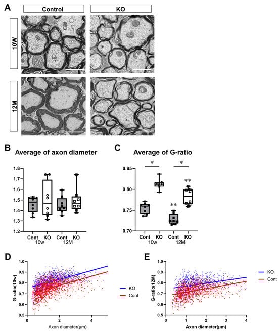Evaluation of the myelin sheath via electron microscopy. Control (Cont) and myelin-specific miR-23a/b cluster knockout mice (KO). We evaluated 120–180 axons per mouse (n = 8 per group). (A) Electron micrographs of the spinal cord cross-sections of Cont and KO mice at 10 weeks (10 W) and 12 months (12 M) of age. Scale bar: 2 μm. (B) Average axon diameter in Cont and KO mice at 10 W and 12 M of age. (C) Average G-ratio in Cont and KO mice at 10 W and 12 M of age. The G-ratio is the ratio of the diameter of the axon without a myelin sheath to the diameter of the axon with a myelin sheath. * Significant difference between Cont and KO mice, ** significantly lower than 10 W mice, p < 0.05. (D,E) Scatter plots of G-ratios versus axon diameter for Cont (red) and KO (blue) mice at (D) 10 W and (E) 12 M of age.
