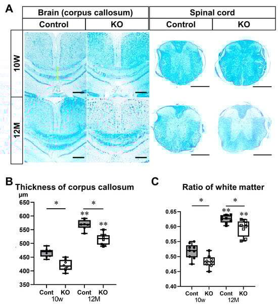 To further evaluate the myelin sheath, white matter was assessed using Luxol Fast Blue staining of the brain and spinal cord (Figure 6). The thicknesses of the brain corpus callosum were 466.22 ± 15.32 µm in 10-week-old control mice, 420.13 ± 20.22 µm in 10-week-old KO mice, 568.00 ± 18.11 µm in 12-month-old control mice, and 515.75 ± 21.12 µm in 12-month-old KO mice (n = 8/group). The brain corpus callosum was significantly thinner in KO mice than in the control mice at 10 weeks and 12 months of age (p < 0.01). In addition, the brain corpus callosum was thicker at 12 months than at 10 weeks of age in the control and KO mice (p < 0.01; Figure 6A,B). In transverse sections of the spinal cord, the ratios of white matter to spinal cord cross-sectional area were 0.52 ± 0.02 in 10-week-old control mice, 0.48 ± 0.02 in 10-week-old KO mice, 0.63 ± 0.01 in 12-month-old control mice, and 0.60 ± 0.03 in 12-month-old KO mice (n = 8/group). The ratio of white matter to spinal cord cross-sectional area was significantly lower in KO mice than in control mice at 10 weeks (p = 0.02) and 12 months (p = 0.04) of age. In addition, the ratio of white matter to spinal cord cross-sectional area was significantly higher at 12 months than at 10 weeks of age in the control and KO mice (p < 0.01; Figure 6A,C).