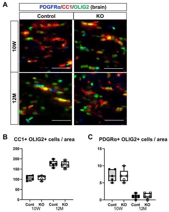 The number of OPCs (double-positive for PDGFRα and OLIG2) per unit area in the corpus callosum was 7.20 ± 1.79 in 10-week-old control mice, 7.00 ± 1.87 in 10-week-old KO mice, 1.00 ± 0.71 in 12-month-old control mice, and 1.20 ± 0.84 in 12-month-old KO mice (n = 5/group). One-way ANOVA showed significant differences between the groups (F(3,16) = 30.41, p < 0.01). The number of OPCs at 12 months of age was significantly greater than at 10 weeks of age in the control and KO mice (p < 0.01). However, no significant difference was observed between the control and KO mice at 10 weeks or 12 months of age (p = 1.00; Figure 7C).
