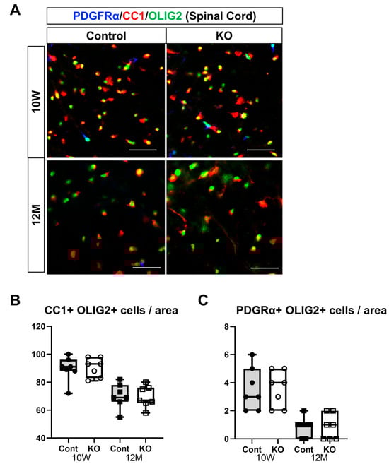 In the spinal cord, the number of mature oligodendrocytes per unit area was 89.57 ± 8.81 in 10-week-old control mice, 90.57 ± 6.80 in 10-week-old KO mice, 70.29 ± 8.75 in 12-month-old control mice, and 69.57 ± 7.68 in 12-month-old KO mice (n = 7/group). One-way ANOVA showed significant differences between the groups (F(3,24) = 14.62, p < 0.01). The number of mature oligodendrocytes at 12 months was significantly greater than at 10 weeks of age in the control and KO mice (p < 0.01). However, no significant difference was observed between the control and KO mice at 10 weeks or 12 months of age (p = 1.00; (Figure 8B). The number of OPCs per unit area in the spinal cord was 3.57 ± 1.51 in 10-week-old control mice, 3.86 ± 1.77 in 10-week-old KO mice, 0.86 ± 0.69 in 12-month-old control mice, and 0.86 ± 0.90 in 12-month-old KO mice (n = 7/group). One-way ANOVA showed significant differences between the groups (F(3,24) = 11.40, p < 0.01). The number of OPCs at 12 months was significantly greater than that at 10 weeks of age in the control and KO mice (p < 0.01). However, no significant difference was observed between the control and KO mice at 10 weeks (p = 0.98) or 12 months (p = 1.00) of age (Figure 8C).