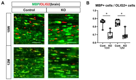 Immunostaining of myelinating oligodendrocytes in brain sections. Control (Cont) and myelin-specific miR-23a/b cluster knockout mice (KO); n = 7 per group. (A) Immunostaining images of the brain corpus callosum stained with myelin basic protein (MBP) and OLIG2 of 10-week-old (10 W) and 12-month-old (12 M) Cont and KO mice. (B) Ratio of the number of myelinating oligodendrocytes showing double-positivity for MBP and OLIG2 to the number of OLIG2-positive oligodendrocytes. * Significant difference between Cont and KO mice, p < 0.05.
