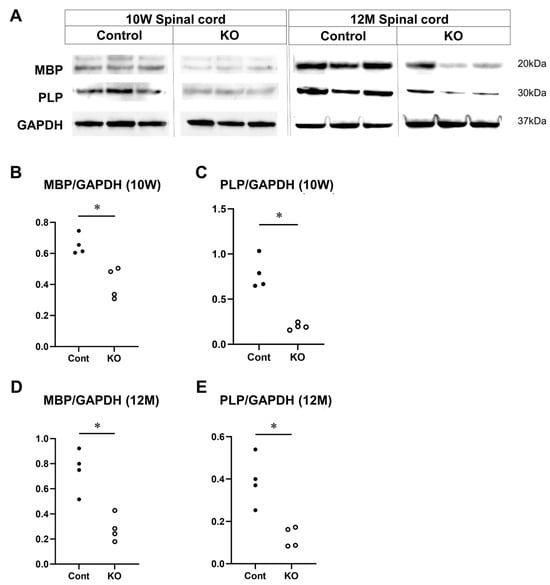 To determine the effects of the myelin-specific miR-23a/b cluster deletion on MBP and PLP—proteins important for myelin formation—their expression levels were measured in the spinal cord white matter at 10 weeks and 12 months of age via Western blotting (n = 4/group; Figure 10A). The relative expression level of MBP to GAPDH at 10 weeks of age was 0.65 ± 0.06 in control mice and 0.42 ± 0.11 in KO mice (p = 0.03; Figure 10B). The relative expression level of PLP to GAPDH was 0.78 ± 0.18 in control mice and 0.20 ± 0.04 in KO mice (p = 0.03; Figure 10C). At 12 months of age, the relative expression level of MBP to GAPDH was 0.75 ± 0.17 in control mice and 0.28 ± 0.11 in KO mice (p = 0.03; Figure 10D). The relative expression level of PLP to GAPDH was 0.39 ± 0.12 in control mice and 0.13 ± 0.05 in KO mice (p = 0.03; Figure 10E). These results show that the myelin-specific deletion of miR-23a/b clusters reduces MBP and PLP expression in spinal cord white matter.