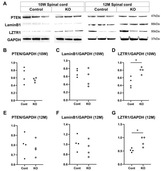 Expression of candidate targets of miR-23a/b clusters. Control (Cont) and myelin-specific miR-23a/b cluster knockout mice (KO); n = 4 per group. (A) Representative Western blots of phosphatase and tensin homolog deleted on chromosome 10 (PTEN), lamin B1, LZTR1, and glyceraldehyde-3-phosphate dehydrogenase (GAPDH) of 10-week-old (10 W) and 12-month-old (12 M) Cont and KO mice. (B) Relative expression of PTEN to GAPDH at 10 weeks of age. (C) Relative expression of lamin B1 to GAPDH at 10 weeks of age. (D) Relative expression of LZTR1 to GAPDH at 10 weeks of age. (E) Relative expression of PTEN to GAPDH at 12 months of age. (F) Relative expression of lamin B1 to GAPDH at 12 months of age. (G) Relative expression of LZTR1 to GAPDH at 12 months of age. * Significant difference between Cont and KO mice in all test groups, p < 0.05.