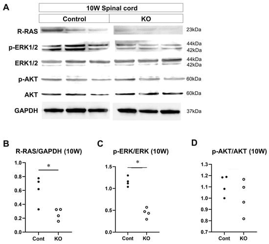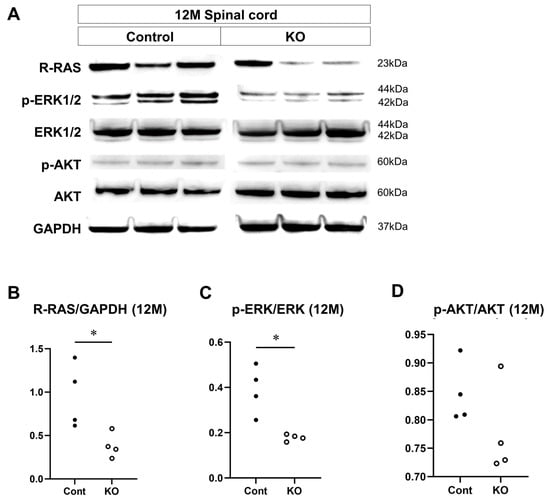 The effects of the deletion of myelin-specific miR-23a/b clusters on the expression of signaling factors involved in myelin formation were evaluated through Western blotting of the spinal cord white matter at 10 weeks and 12 months of age (n = 4/group; Figure 12A and Figure 13A). At 10 weeks of age, the relative expression level of R-RAS to GAPDH was 0.61 ± 0.20 in control mice and 0.26 ± 0.08 in KO mice (p = 0.03; Figure 12B). The ratio of p-ERK1/2 to total ERK1/2 was 1.15 ± 0.11 in control mice and 0.44 ± 0.11 in KO mice (p = 0.03; Figure 12C). In contrast, the ratio of p-AKT to total AKT was 1.11 ± 0.09 in control mice and 1.01 ± 0.15 in KO mice (p = 0.34; Figure 12D). At 12 months of age, the relative expression level of R-RAS to GAPDH was 0.95 ± 0.37 in control mice and 0.38 ± 0.14 in KO mice (p = 0.03; Figure 13B). The ratio of p-ERK1/2 to total ERK1/2 was 0.39 ± 0.11 in control mice and 0.18 ± 0.01 in KO mice (p = 0.03; Figure 13C). In contrast, the ratio of p-AKT to total AKT was 1.06 ± 0.17 in control mice and 0.89 ± 0.15 in KO mice (p = 0.20; Figure 13D). These results indicate that the deletion of myelin-specific miR-23a/b clusters reduced R-RAS expression and ERK phosphorylation, but not AKT phosphorylation, at 10 weeks and 12 months of age.